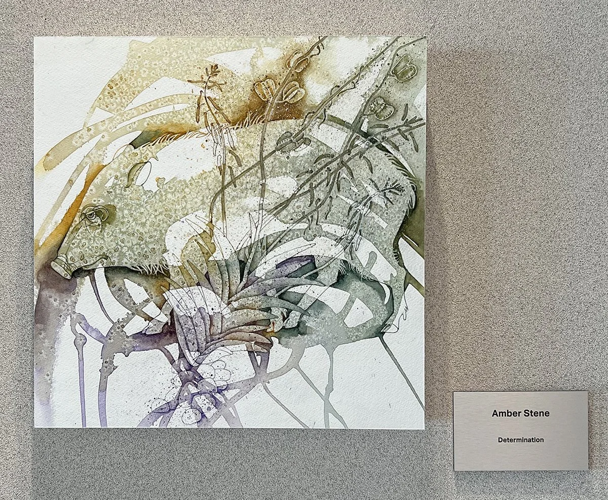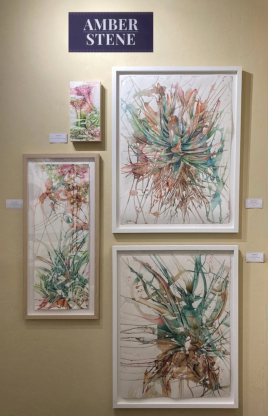 My exhibition, “Survival in the Sonoran Desert,” at Entry Gallery Project Space features 11 watercolors of succulents over pre-poured abstract elements, and eight assemblage works with grapevines and organics on cardboard.