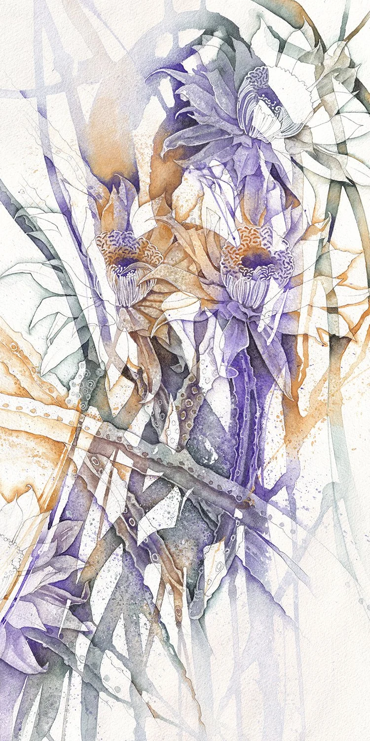 I start each botanical watercolor as an abstract pouring that expresses the environmental conditions. Then I integrate the succulent into the pouring, allowing the botanical subject and abstract element to coexist – celebrating the symbiotic relationship between these unique plants and the harsh Sonoran Desert. The assemblage grapevine creations reference concepts in the cycle of life – rainfall, rebirth, and growth.